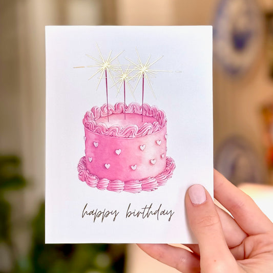 "Happy Birthday" Pink Cake with Metallic Sparkler Birthday Card